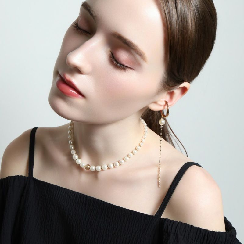 耳元には一粒のパールもついており、柔らかく落ち着きのある印象に。