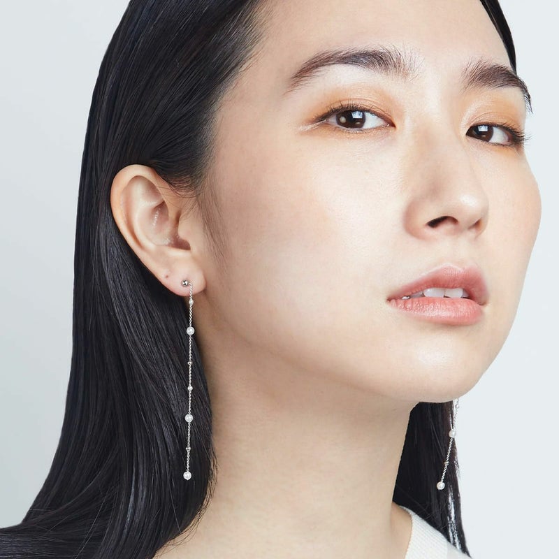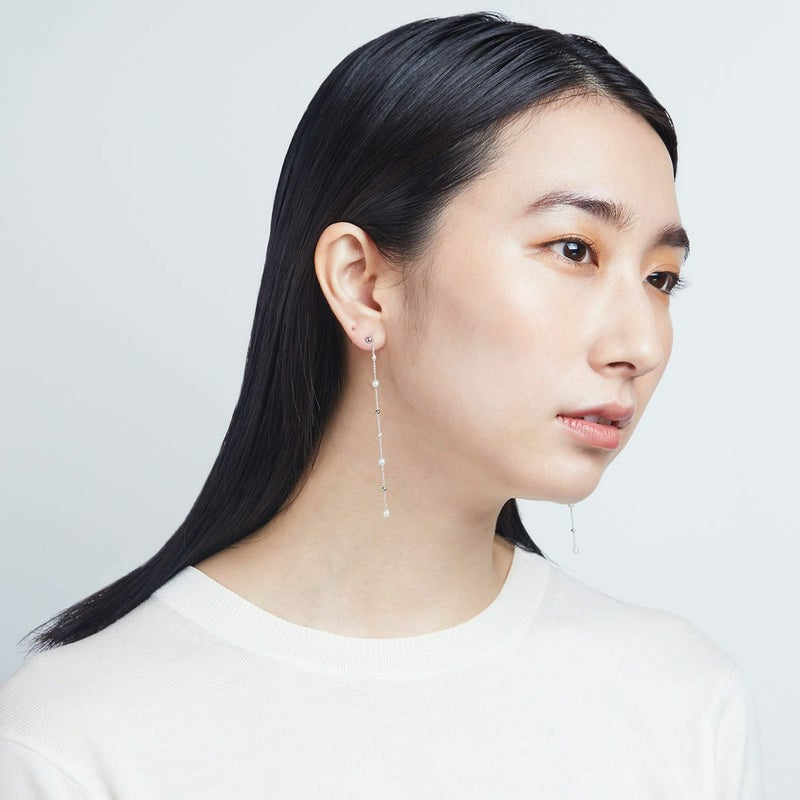 天然では表現できない軽さと美しさの均等性が魅力なプラスティックパール。半永久的に持続可能なサスティナブルパール。小粒なサイズ展開が可能なプラスティックパールで繊細な粉雪のようなピアスをデザインしました。シルバーカラーでonoff使いやすく、女性らしく。医療用に使用されるサージカルステンレスポストは肌にも優しい。2022年は環境にも肌にも優しいピアスからスタートしませんか?小粒なパールとシルバーボールでジュエリーライクな王道ステーションピアスに。ステラハリウッドにありそうでなかった軽くて華奢な女性らしさが魅力のコーディネートしやすいピアスです。